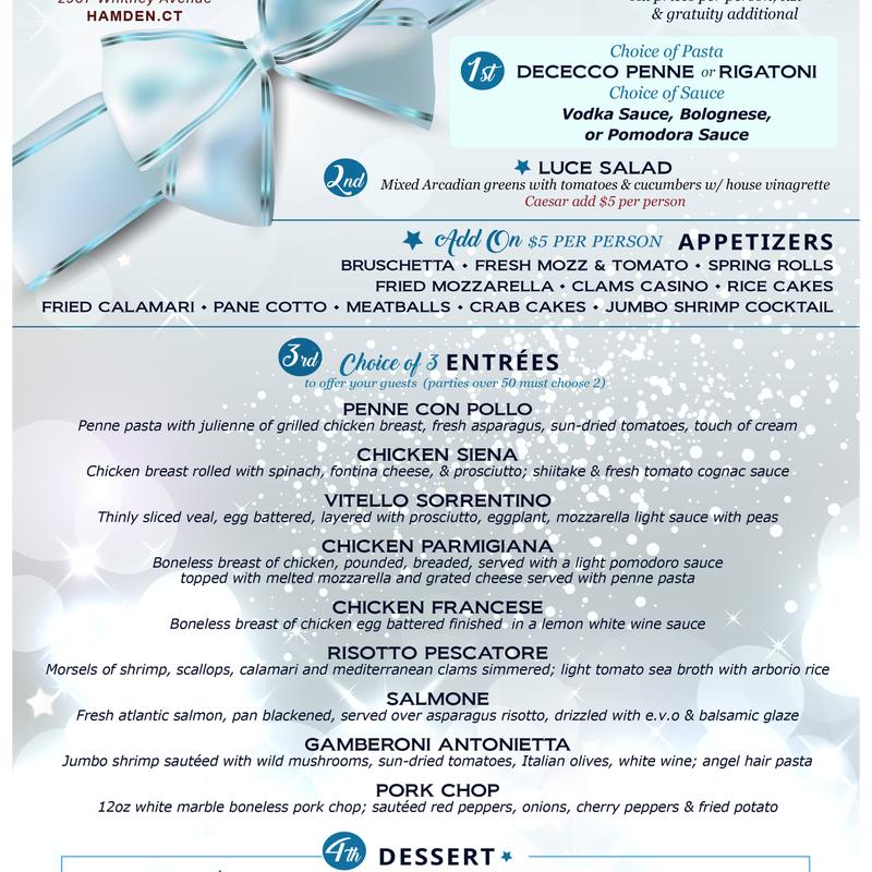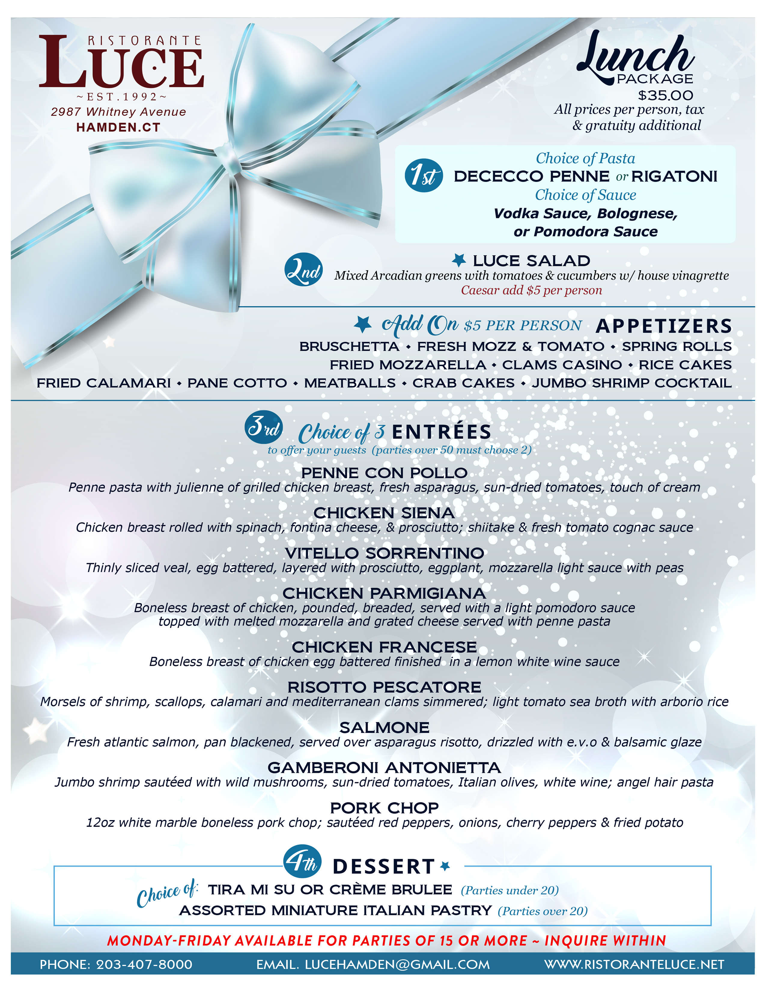 All trays feed 15-20 people | Please allow 24 24-hour notice for multiple tray orders. We will do our best to make the trays ordered on the same day. All food is cooked to order…Nothing frozen! Luce uses only the best ingredients. Heating instructions: All food can be reheated with cthe over off 25 minutes @ 375