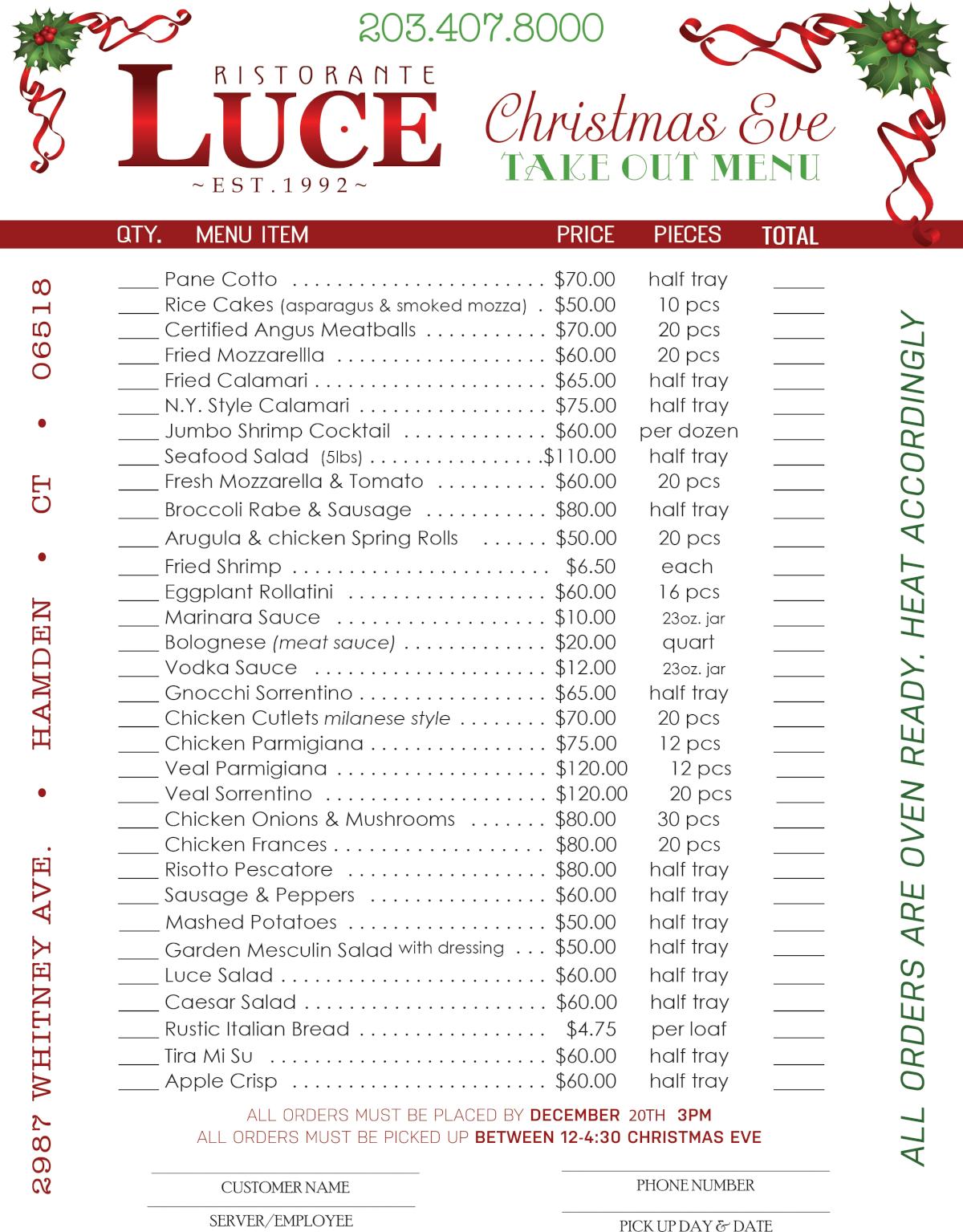 All trays feed 15-20 people | Please allow 24 24-hour notice for multiple tray orders. We will do our best to make the trays ordered on the same day. All food is cooked to order…Nothing frozen! Luce uses only the best ingredients. Heating instructions: All food can be reheated with cthe over off 25 minutes @ 375
